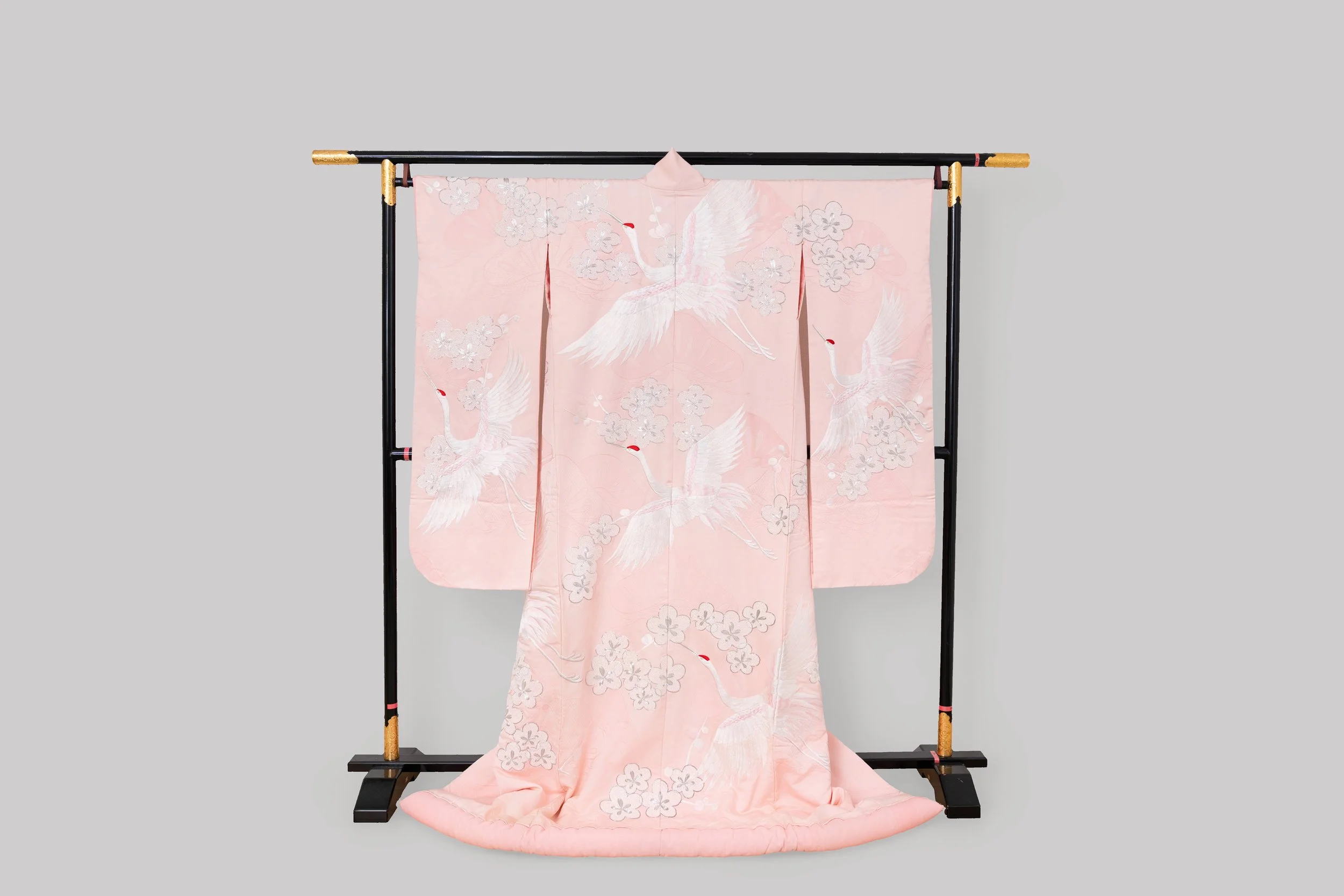 溫柔的淡櫻粉底色,如同初春微風吹拂,拂出一片和煦的輕盈潔白的鶴群成雙飛舞,羽翼舒展的姿態在淡粉中顯得格外靈動