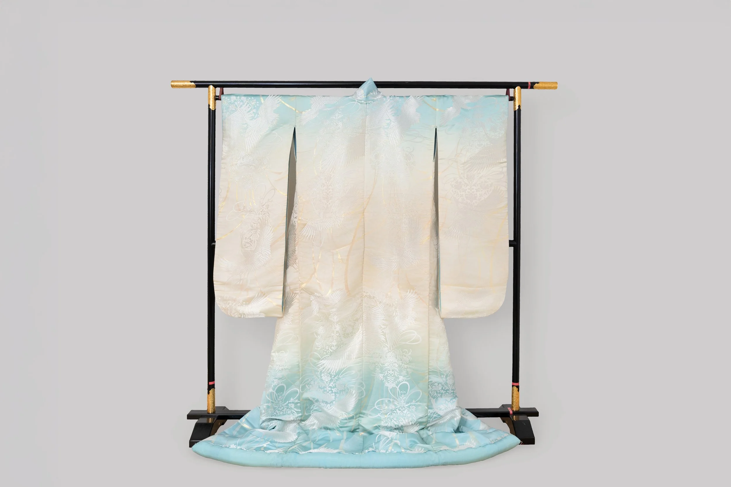 ・色打掛 IUK-10 清透的薄荷碧色,由領口與裙擺處向中心暈染出細膩的層次,像是靜謐的湖面映照著晨曦,帶有一種超脫世俗的靈透感銀白色絲線織成的鶴群,在淡雅的基調中舒展羽翼,不刻意張揚的色彩配置,反而突顯了工藝本身的光澤與質地 View fullsize View fullsize View fullsize View fullsize